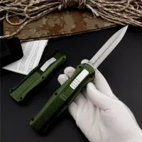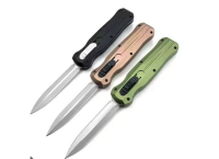 The firing button is located near the top handle. It is slightly oversized for ease of use. When the button is pressed, the blade pops out quickly like a BM. When the button is slid back under, the blade closes quickly and tightly. This double action OTF knife is rugged and ready to go