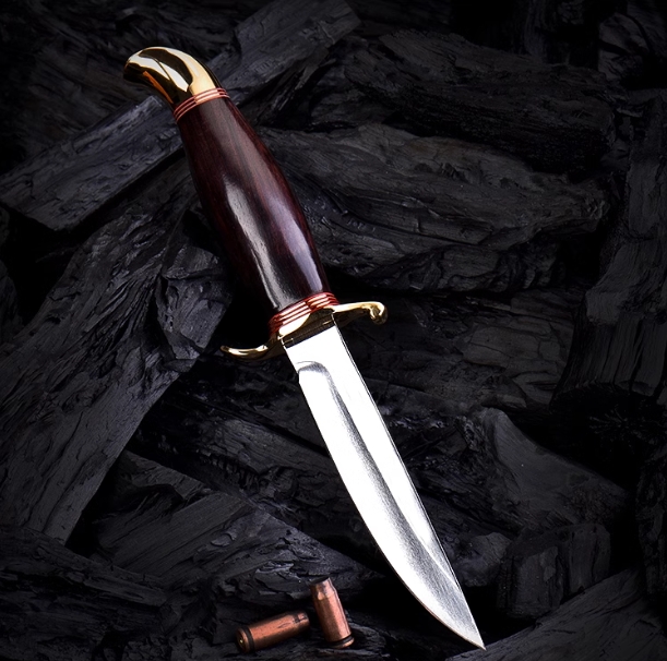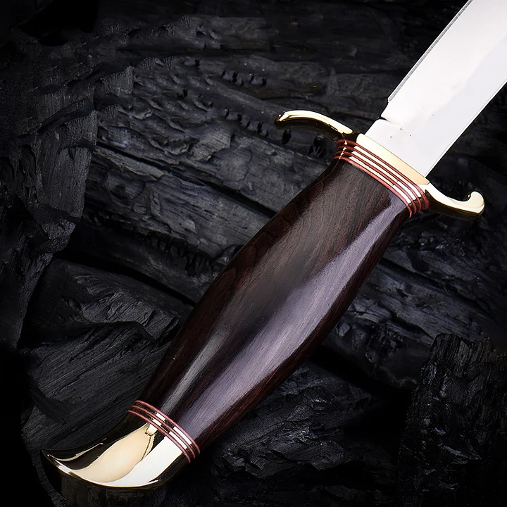The handle is made of precious black ironwood with hard wood and glossy surface as the handle, and the golden brass is used as the hand guard, making this Cheka knife extremely luxurious. The unique S-shaped hand guard can protect the safety and safety of the hand during use. Protective. It can be said that this is an excellent knife that can be collected, used, played and given as a gift. Anyone who sees such an exquisite fixed knife will fall in love with it!