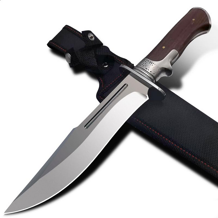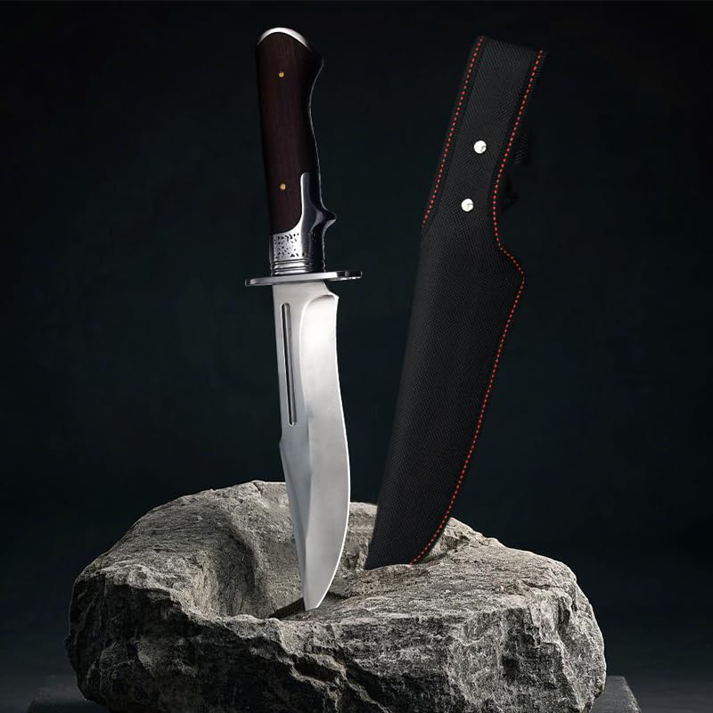 Large hunting knife features a substantial blade suitable for demanding outdoor tasks