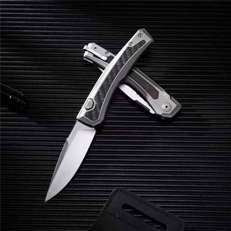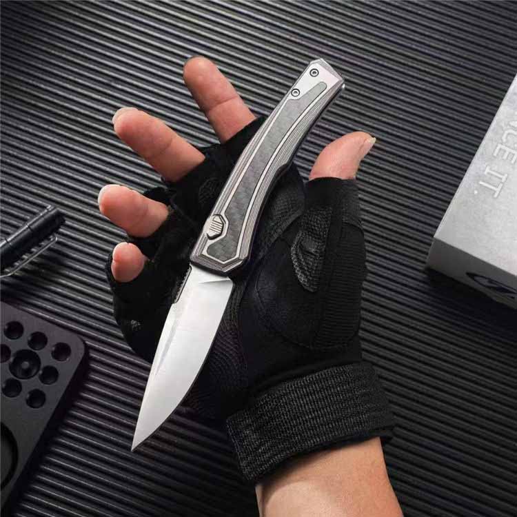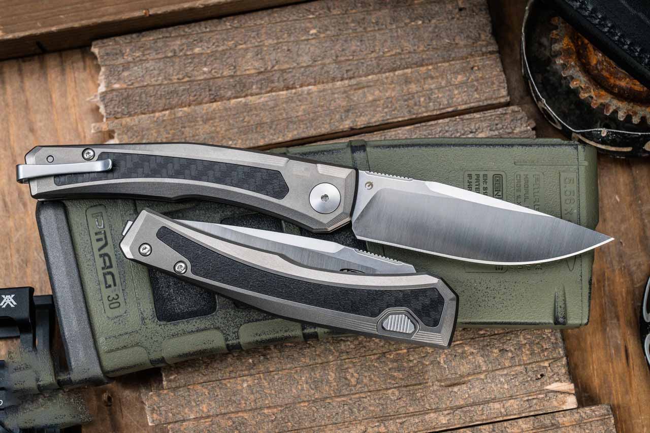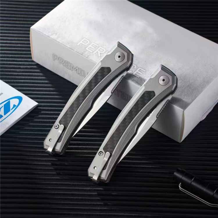 The handle is made of titanium and has been sandblasted to give it a matte tone and a pleasant touch. The carbon fiber inserts on both sides of the handle not only make the design lighter but also add a high-end look. The ergonomic design of the handle has been taken into account to the smallest detail, providing a comfortable and secure grip. This model is equipped with a deep reversible clip that allows you to carry the knife on the right or left side and place it in the tip-up position.